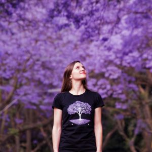 This hand-drawn Jacaranda design by Greyloerie is a seasonal edition T-shirt featuring Hadedas foraging under the tree.