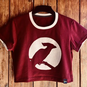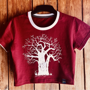 This top features a hand-drawn Baobab by Greyloerie on a limited edition maroon and white crop-top.
