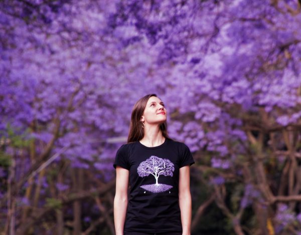 This hand-drawn Jacaranda design by Greyloerie is a seasonal edition T-shirt featuring Hadedas foraging under the tree.